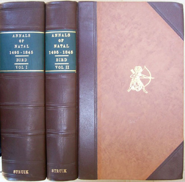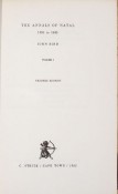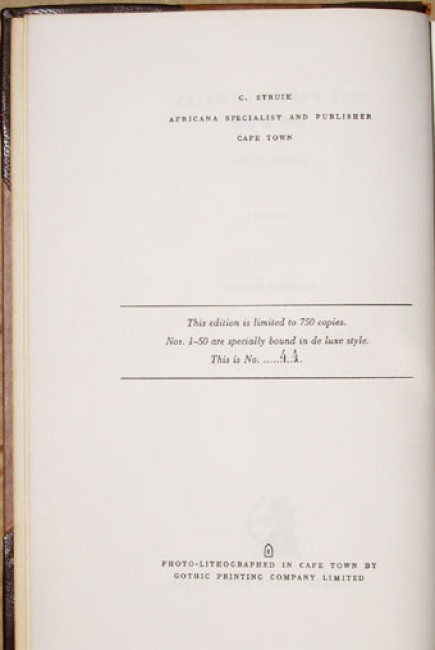 Two volume set, numbers xiv + xv of the Africana Collectanea Series. The edition was limited to 750 copies, of which 50 were specially bound in leather. Original brown leather spines and corners with gilt titling on the spines and the publisher's device on the upper boards. Volume 1 has 8 prelims followed by a facsimile of the original Maskew Miller edition, xiv prelims, 754 pages. Volume 2 has 6 prelims, followed by the facsimile, xv prelims and 497 pages. A useful edition for researchers as the publisher included the Killie Campbell Library Index.