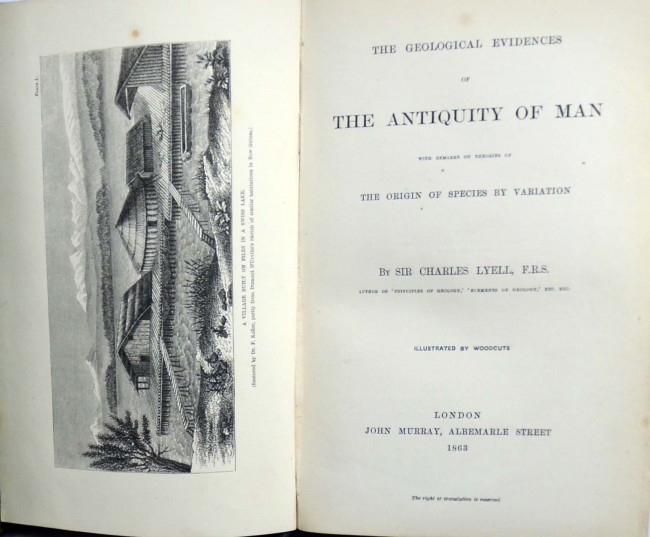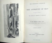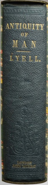 This is a wonderful copy of this important book by Lyell who was a close friend of Darwin and one of the first supporters of his Origin of The Species. The full title of this work is - The Geological Evidences of The Antiquity of Man. In the original embossed green cloth with a gilt decoration on the front board. The cloth is in unusually nice state. There is a small bookplate on the front pastedown and the brown endpapers are slightly mottled. The front hinge has a 4cm. split but remains tight. There is some very mild foxing on a few pages but not extensive. 520pp. with 32 pp. advertisements dated January 1863. With 2 woodcuts plates and numerous in text woodcut illustrations. In a custom made marbled slipcase with leather trimmings. A superb copy.