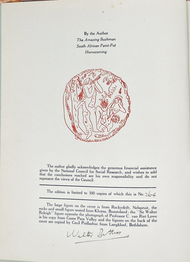Limited edition: 249 + 1 page - a hand-drawn map, 15 tipped-in colour plates, tipped-in capitals in the Bushman style, many photographs and sketches of Bushman paintings, a very good copy in the dust jacket now preserved in a protector.