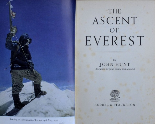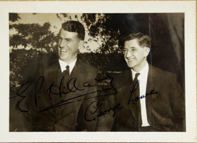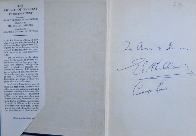 Inscribed and signed by Hillary on the ffep. and also signed by George Lowe. The account of the famous ascent of Everest by Hillary and Tenzing. Hillary wrote chapter 16 of this book "The Summit". A very good minus copy in dw. with some foxing, mainly of the edges. Loosely laid in is a 1x12cm. original glossy press photo of Hillary and Lowe, boldly signed by both of them on the image.