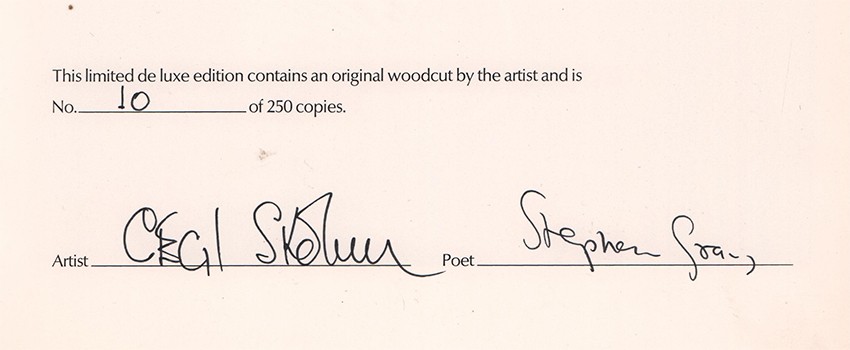 This Limited de luxe edition contains an original woodcut by the artist and is no 10 of 250 copies signed by the artist and the poet.