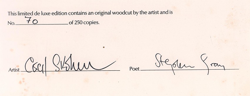 This Limited de luxe edition contains an original woodcut by the artist and is no 70 of 250 copies signed by the artist and the poet.