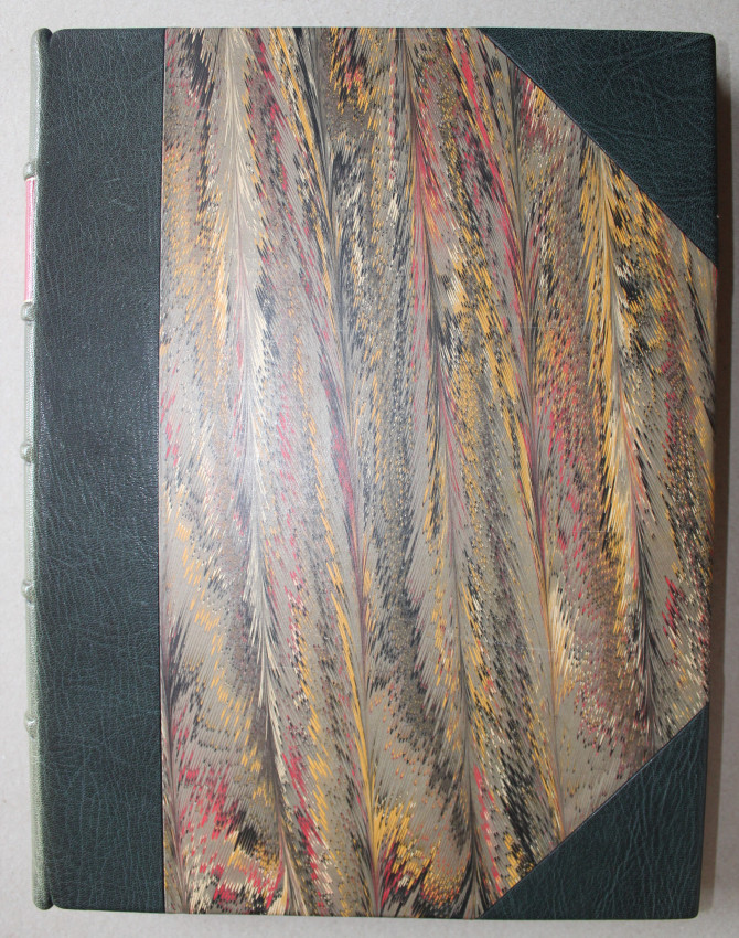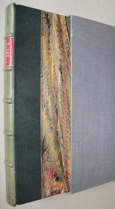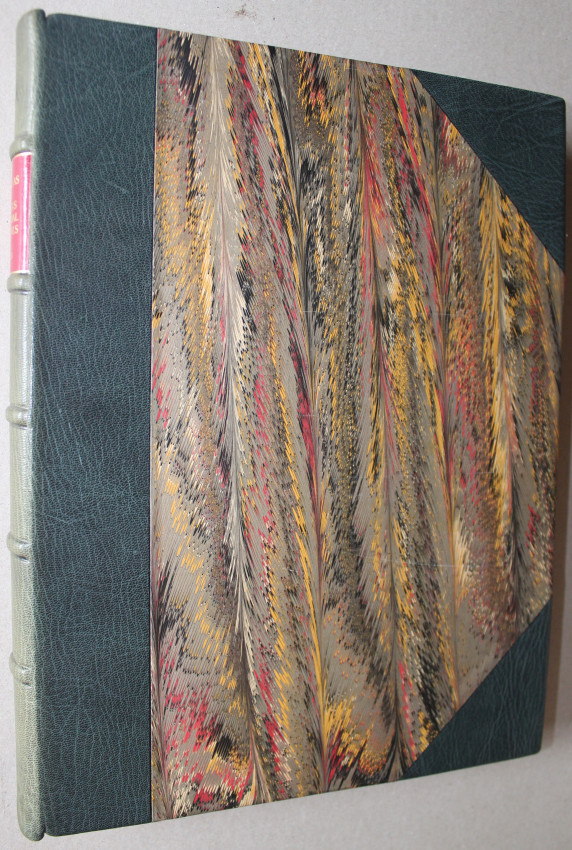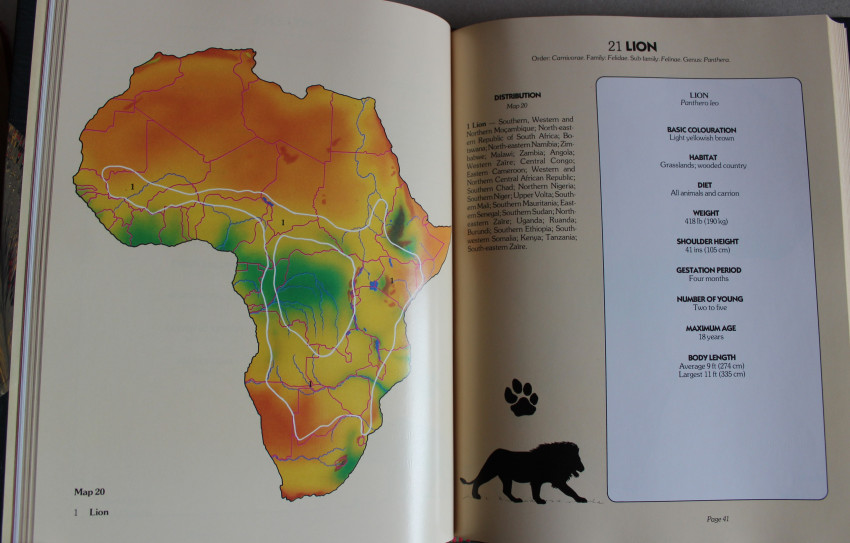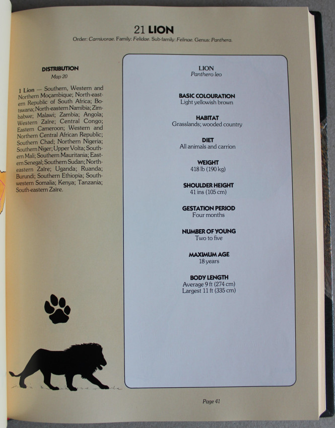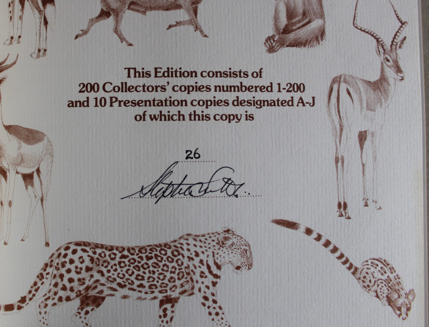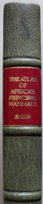 Housed in the original slipcase covered with grey coloured book cloth with hand marbled paper and leather trim matching the binding which has a dark green leather spine, a red title label and marbled paper covered boards. Yellow end papers decorated with a map of Africa. xx prelims, two maps of Africa, 241 pages followed by the index, etc., that picks up the prelim pagination from xxi to xxx. The 121 mammals dealt with each have a full page distribution map, silhouette illustration and an image showing what each animal's spoor looks like.