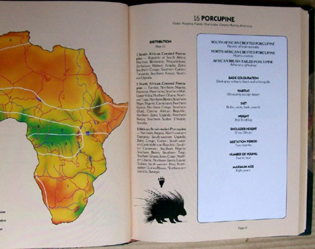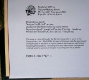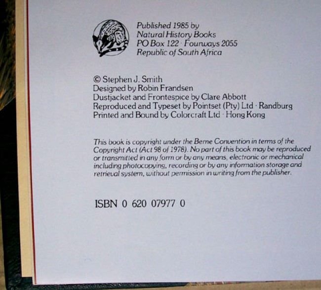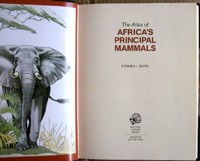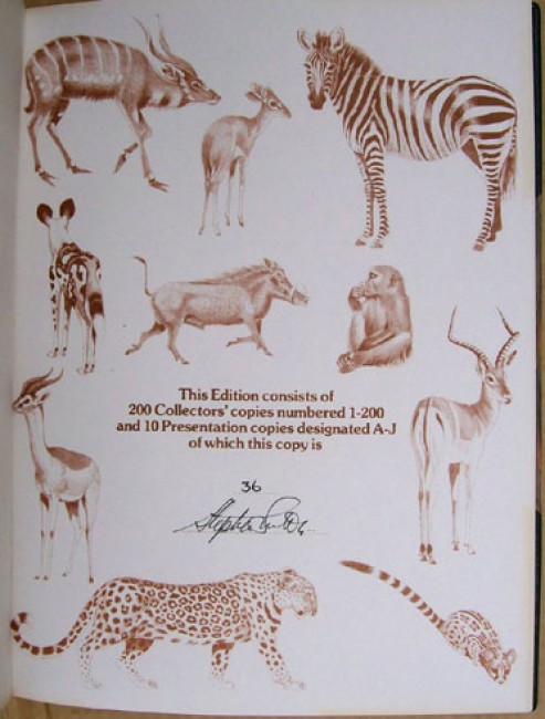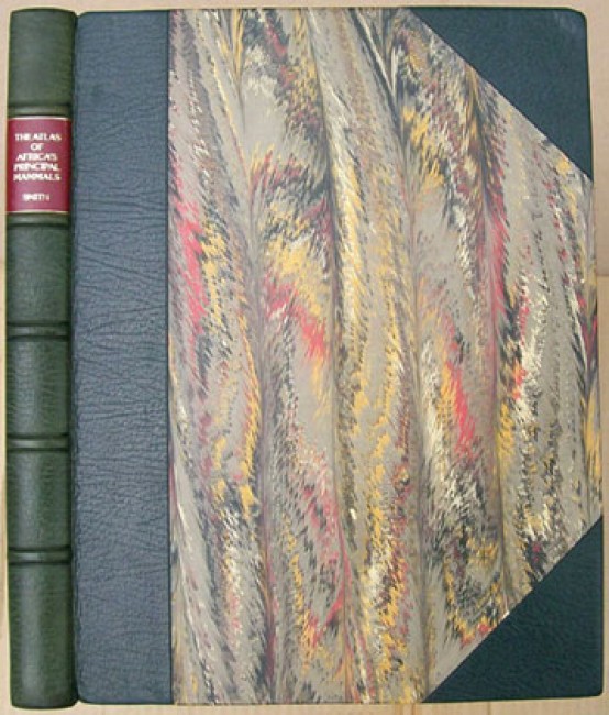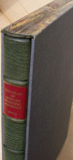 Housed in the original slipcase covered with grey coloured book cloth with hand marbled paper and leather trim matching the binding which has a dark green leather spine, a red title label and marbled paper covered boards. Yellow end papers decorated with a map of Africa. xx prelims, two maps of Africa, 241 pages followed by the index, etc., that picks up the prelim pagination from xxi to xxx. The 121 mammals dealt with each have a full page distribution map, silhouette illustration and an image showing what each animal's spoor looks like.