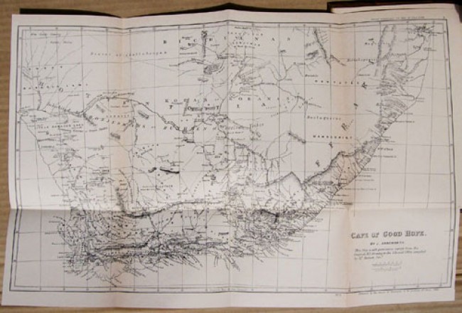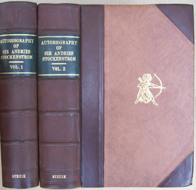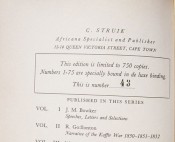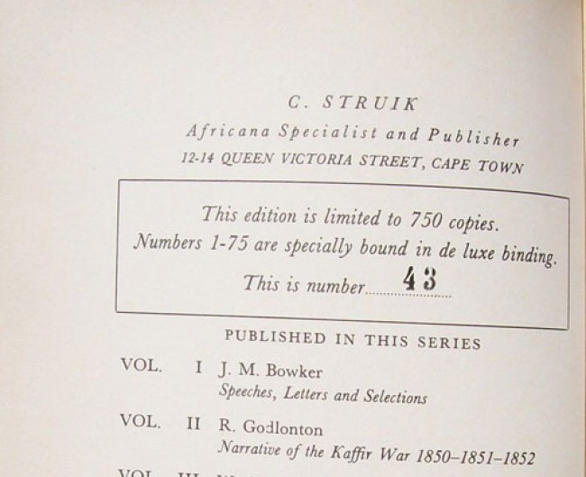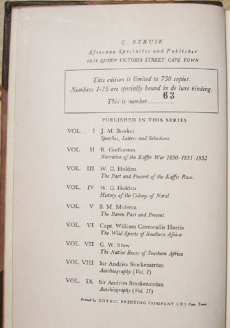 Volume one is copy number 43 and volume two is copy number 63 of 75 copies bound in the de luxe binding. This set is volume numbers 8 and 9 of the Africana Collectanea Series, which was limited to 750 copies of which 75 were specially bound in the "de luxe" leather binding. Original brown leather spines and corners with green title labels on the spines with gilt titling and the publisher's device on the upper boards. This is a facsimile of the 1887 edition published by J. C. Juta. The first volume has xviii prelims, 440 pages, a frontis portrait and a folding map. The second volume has viii prelims, a folding map, 487 pages and 10 index pages.
