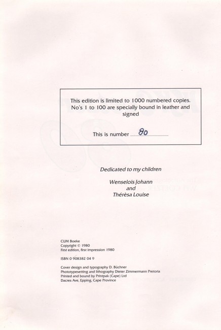 This edition is limited to 1000 numbered copies. No\'s 1 to 100 are specially bound in leather and signed. This copy is number 80.