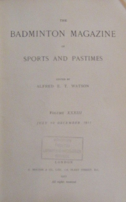 The Badminton Magazine of Sports & Pastimes, july to december 1911, volume XXXIII, hardcover, profusely illustrated,reference library plate and stamp, gilt designs and raised lettering to front boards and spine, 724 pages, 185 x 250mm, condition: very good.