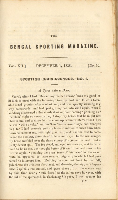 The Bengal Sporting Magazine ran from 1833 – 1845. It was printed in Calcutta by William Rushton, at the Englishman Press.