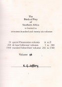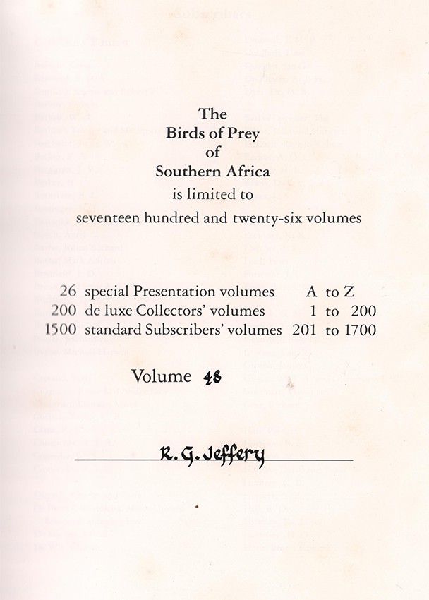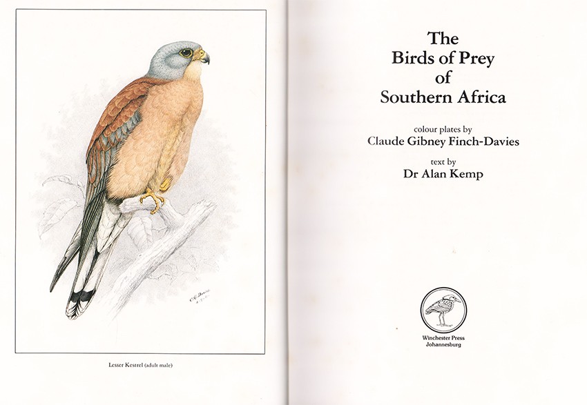 Editor’s note.'The Birds of Prey of Southern Africa is the showcase for the wonderful paintings of birds of prey by the late Claude Gibney Finch-Davies. It is sixty years since this talented artist, of world standard, died tragically. His life and the circumstances surrounding his death are described in a brief biography contained in the book. He illustrated all the birds of prey, including the owls, known in Southern Africa at the beginning of the twentieth century, and only eight other species have been discovered since that time. He depicted the various plumages as they occur with great accuracy and detail so that this collection provides a fine reference source.'