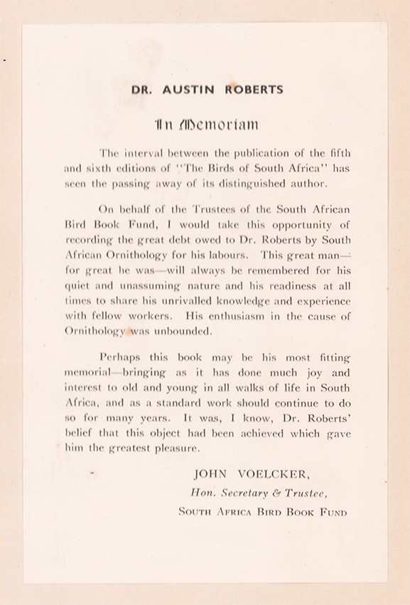 On the front paste down end paper is a pasted in tribute “In Memorium” to Dr Roberts who passed away between the 5th and 6th impressions of the publication of this book on 5 May 1948.
