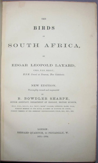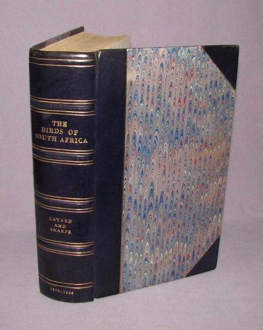 Here is a copy of the New Edition of "The Birds of South Africa", revised and augmented by R. Bowdler Sharpe. This is a simply outstanding copy. The recent fine binding is in nearly as-new condition. Dark brown half leather with raised spine bands, gilt rules, and leather corners over decorated paper covered boards. The contents are superlative - extraordinarily clean and bright with no spotting or previous ownership markings. Even the uncut page edges are nearly pristine. All 12 colored engraving plates are present and in equally superlative condition.