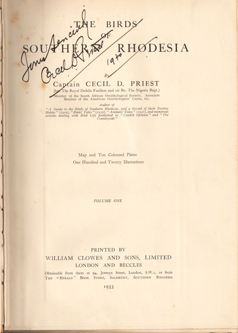 Priest (C.D.) A GUIDE TO THE BIRDS OF SOUTHERN RHODESIA and A Record of Their Nesting Habits.