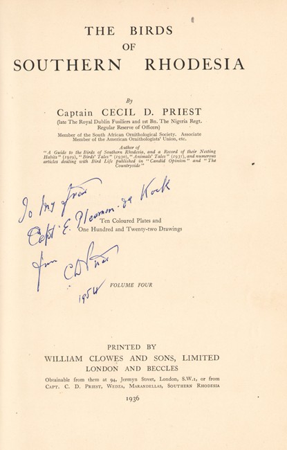 4 volumes, 454+553+355+420 pages, map, 40 colour plates, 521 text illustrations, original blue cloth – dull, soiled and bubbled in places, top edges of volumes I & II gilt, contents good. Volume I signed on the title page, 'Yours Sincerely, Cecil D. Priest, 1940'. Volumes III & IV signed on the title pages, 'To Capt. E. Plewman de Kock, from C.D. Priest, 1952'.