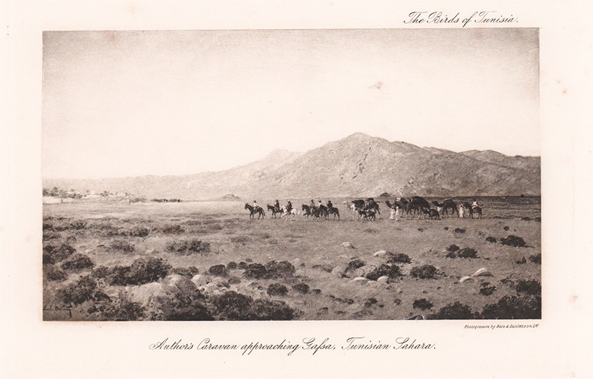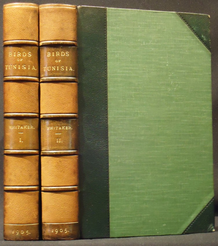 2 volumes: 294 + 410 pages, frontispieces volume 1 - author's caravan approaching Gafsa, volume 2 - author's encampment in the Tunisian Sahara, 2 black and white plates, 15 hand-coloured lithographs by H.Grönvold, 2 folding colour maps, uncut edges, top edges gilt, several pages unopened, foxing mainly on the page edges, half green morocco with matching cloth boards, spines gilt and faded to brown, a very good set.