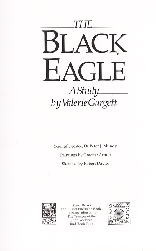 Editor’s note.‘This long-awaited and important volume comprises the most detailed, comprehensive and prolonged single study of an eagle species ever under taken. Thousands of hours of observation in the field during a 21-year period and over 12,000 written records by a team of voluntary birdwatchers, have gone into the investigation of the behaviour and breeding of some 60 pairs of Black Eagles in their natural environment, the Matobo Hills of Zimbabwe.’