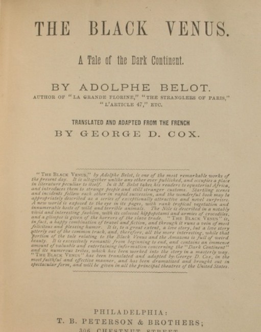 Translated and adapted from the French (La Venus Noire) by George, D. Cox. Original blue cloth, gilt titles to front, black titles on spine and back cover. pp 276 + (28) ads, front hinges cracked, text blocks intact, pages yellowing, spine ends chipped. Assumed First English Edition. A scarce title.