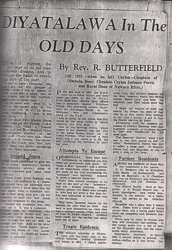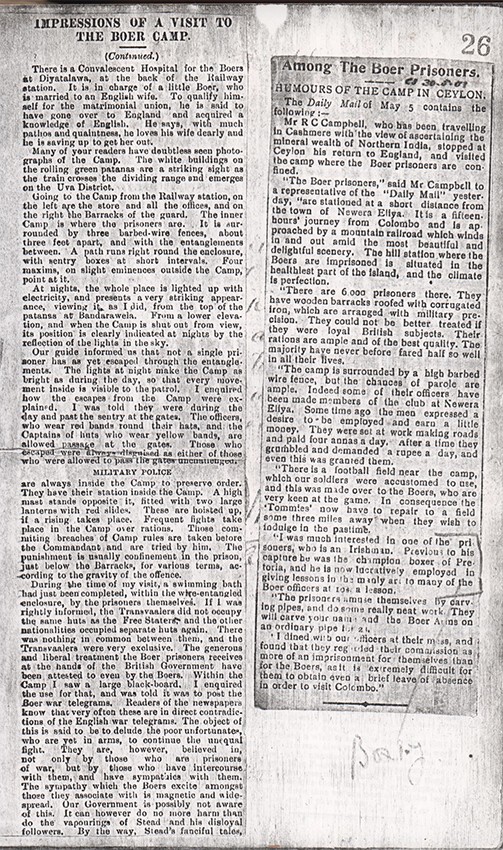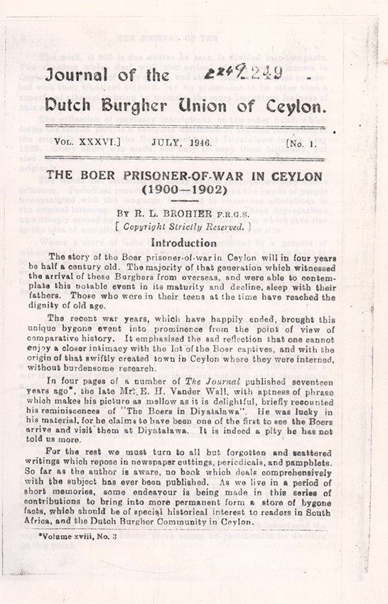During the period July 1946 to July 1947 five articles, written by R. L. Brohier regarding the Prisoners of the Boer War in Ceylon, were published in the Dutch Burgher Union Journal in Colombo.