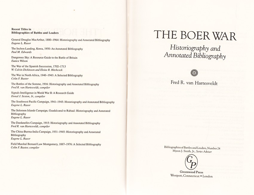 Extracted from a review by Bill Nasson: Fred R. van Hartesveldt's historiographical and bibliographical source book focuses mostly on the military side of the story, although its extensive listings include useful works with political, economic and social themes. The Boer War provides a compact introductory narrative of the war and its imperial context, and a fairly comprehensive assessment of its developing historiography. These forty-odd pages of crisp and sober prose contain some nice touches, as when Professor van Hartesveldt reminds readers that while the Boers had fought the war 'for ideology--nationalism and freedom (though not necessarily freedom for all)', the British 'had defined the war in terms of geography' (p. 31).