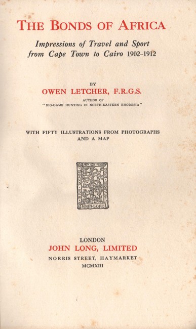 Czech (Dr. Kenneth) An Annotated Bibliography of African Big Game Hunting Books 1785-1999 (New edition 2011), page 164, 'Letcher spent time hunting in North-Eastern Rhodesia's Luangwa Valley after elephant and Rhinoceros. In British East Africa he bagged buffalo along the Guaso Nyiro River as well as gerenuk, giraffe, oryx, gazelle and other game. An often overlooked work with considerable big game hunting.'
