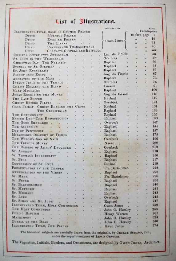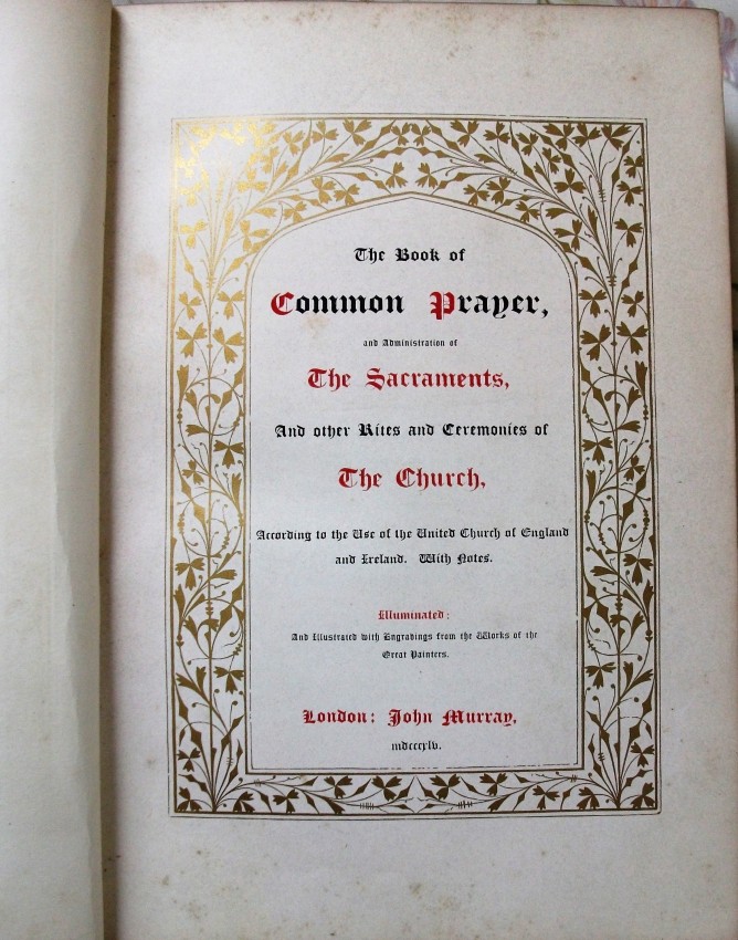 CONDITION NOTES. A blue cloth embroidered with a cross in gold and white silk substitutes for a dustjacket for this copy and remains in very good condition (see image). The boards and spine of the book are lightly rubbed. The page-edge gilding remains bright. A white panel with the crest and signature of Henry Thompson is pasted on to the front paste-down (see image). There is a crack along the depth of the book-block between the front free endpaper and the first plain leaf, but the hinges are undamaged and the book remains tightly bound (see image). More importantly, "the 41 historical plates redrawn from originals by Raphael and other artists", referred to in the list of illustrations (see image), were not bound into either this copy or an unknown number of other copies. This is believed to have been because the volume was not commercially viable either with, or perhaps even without, these additional "carefully copied" colour plates: the publisher's history app refers to the non-viability of Owen Jones's luxuriously (and lovingly) produced 1845 Book of Common Prayer, but with no further detail. The contents are otherwise complete, unmarked and bright.