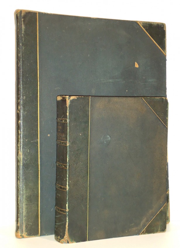 First edition Text volume: clv, [1], 377, [1]pp, original half dark green leather over pebble grained boards, there is a mark on the front cover, titled gilt on the spine which is split at the top and the bottom, uncut edges, pages starting to detach at the front hinge and some sections loose.