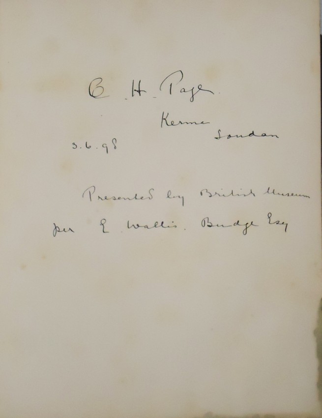 The inscription on a front free end paper reads: C.H. Page Kerma Soudan (sic) 3.6.98 Presented by the British Museum per E. Wallis Budge Esq.