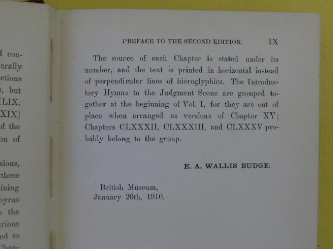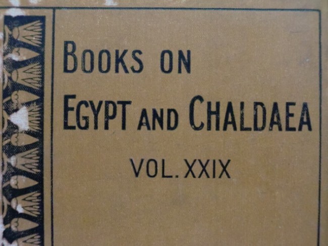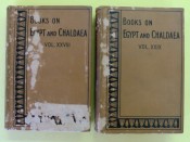 Two consecutive volumes of Books On Egypt And Chaldea - The Chapters Of Coming Forth By Day or, The Theban Recension of the BOOK OF THE DEAD - The Egyptian Hieroglyphic Text Edited From Numerous Papyri, both first printings of the second edition (first 1897), of Budge\'s compilation of these important papyri, Volume XXVIII containing a Preface To The Second Edition, and a Description Of The Papyri, of which chapters I-LXIV (1-64)are herein reproduced,. Volume XXIX contains chapters LXV-CLII (65-152), entirely in hieroglyphs. Books\' condition: both volumes in good condition, endpapers quite heavily browned, texts good with no markings, some gatherings cracked (vol.28 more so), page edges browned, boards good though with patches of erosion/damage concentrated around the spine areas and front covers; and vol.28 rear hinge threadbare in places. Bookplates of The International Freemasonic Order pasted to f.p.e.p\'s, as well as bookplates of \'Percy A.Peall\'. This 1910 first printing edition is quite scarce.