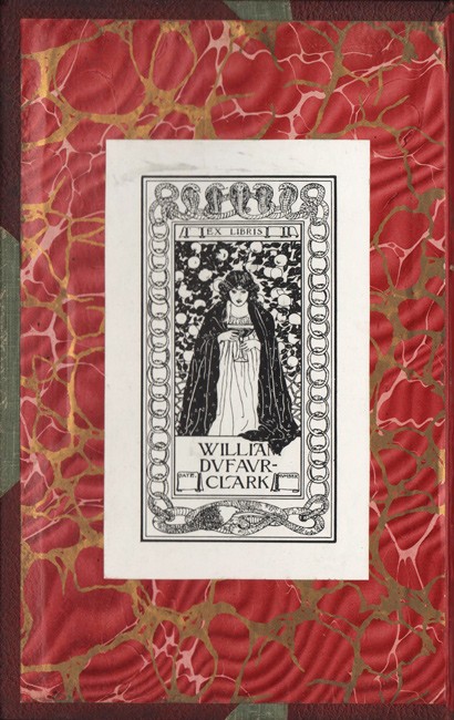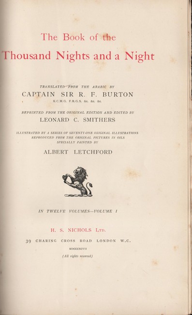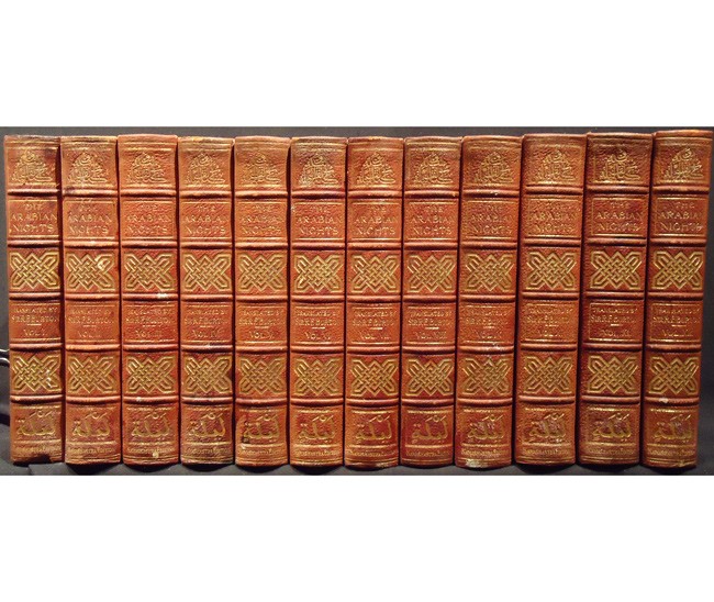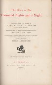 12 volumes, bound in three-quarter red morocco, with green art linen sides, gilt titling and decoration on the spines in panels, Kamashastra Edition at the base of the spines, top edges gilt, other edges uncut, marbled endpapers with red cloth hinges, portrait of Burton as frontispiece in volume I and many other illustrations, book plate of William Dufaur-Clark on each front paste-down endpaper. The leather is slightly rubbed on the spines, some insect scarring on the cloth sides, light foxing throughout, a good set.