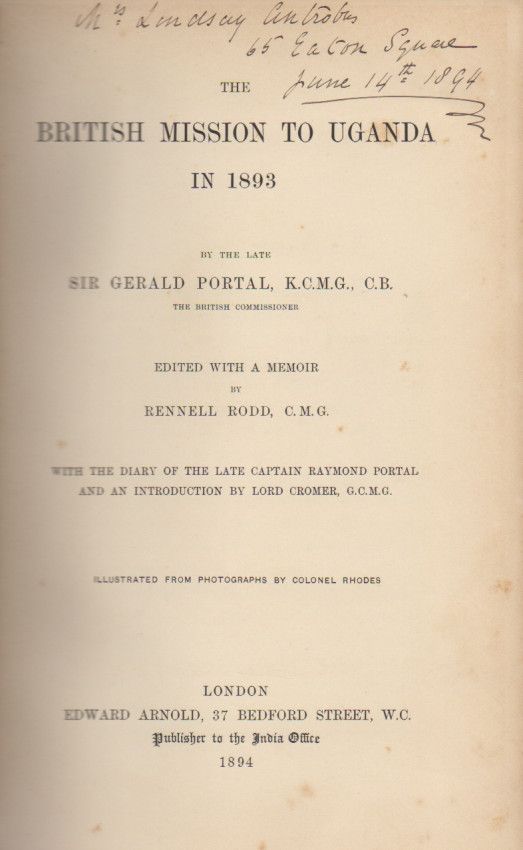 Portal was assigned to head a government mission to Uganda to assess the region’s problems and possibilities after the withdrawal of the Imperial British East Africa Company. Crossing the Taro Plain and the Kibwezi River, the expedition entered rich game lands with subsequent hunting for rhinoceros and lion. At Port Alice, hippopotamus were bagged, with additional hippo shooting on the Tana River. There are also several mentions of sport in Raymond Portal’s unedited diary. Raymond, brother of Sir Gerald, died of fever on the expedition. Original brick red cloth with gilt African native vignette on front cover and gilt spine titles. Illustrated with full page plates and text illustrations, folding colored map at end. 31 page book catalog at rear. Original endpapers, front inner hinge just starting. Previous owner's bookplate on front paste down.