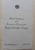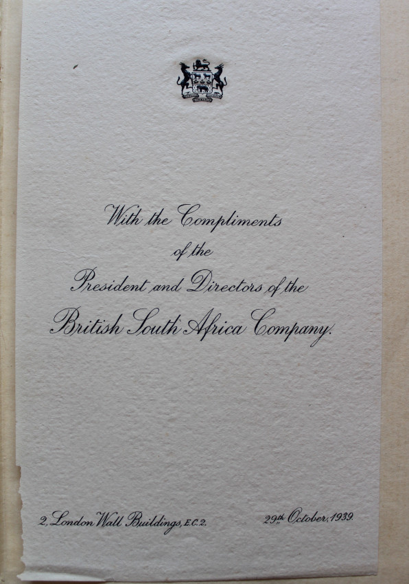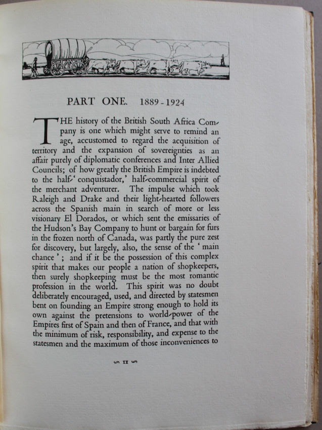 Printed and made into a book for the British South African Company. By Herbert Fitch & Co. Ltd. Hand-made paper by Saunders, Kent. Set in monotype poliphilus.
