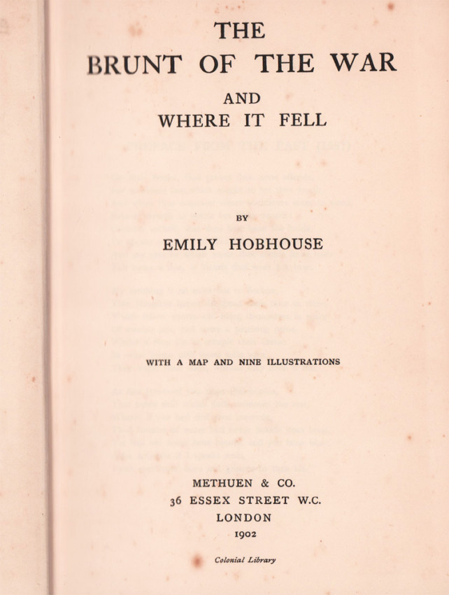 Mendelssohn (Sidney) South African Bibliography volume 1, page 719: A perusal of this volume would probably lead the reader to believe that only that part of the South African population suffered during the war who were favourable to the Boer cause, and the author states, " Never before have women and children been so warred against. England, by the hands of Lord Roberts and Lord Kitchener, adopted the policy of Spain, while improving on her methods."