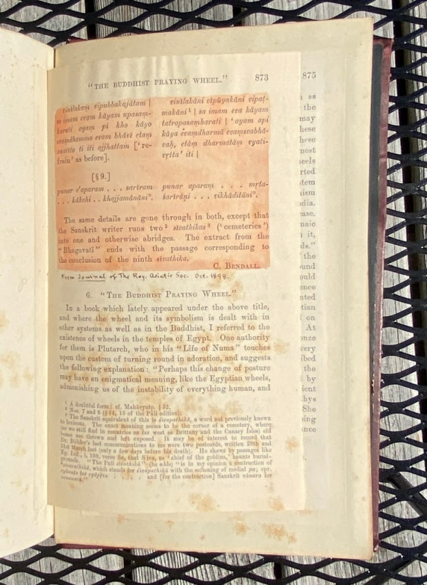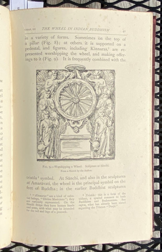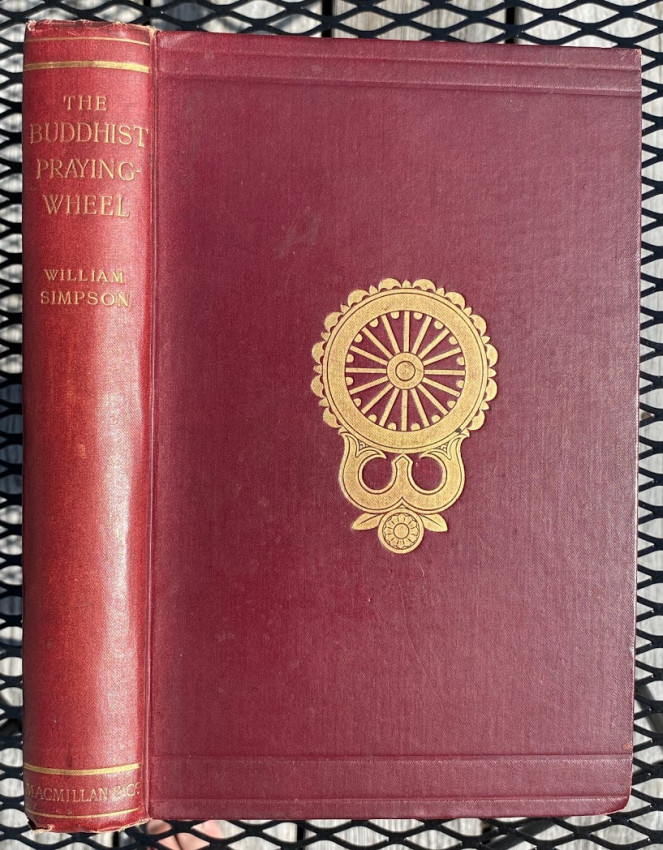 The Buddhist Praying-Wheel A collection of material bearing upon the symbolism of the wheel and circular movements in custom and religious ritual. London: Macmillan & Co., Ltd, 1896. Octavo (8 7/8 x 5 3/4in; 225 x 146mm). P p.[i-]viii; [1-]304. Frontispiece, numerous illustrations, extra-illustrated with a loosely inserted alternative version of the illustration at p. 18, a 3pp. extract (by Simpson) from the ‘Journal of the Royal Asiatic Society’ mounted at the rear, original cloth gilt.