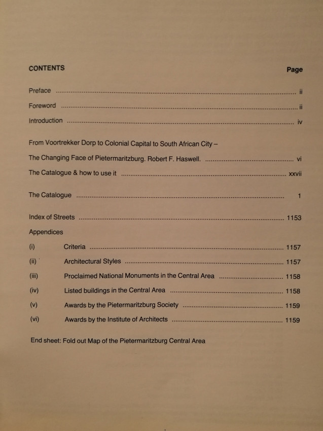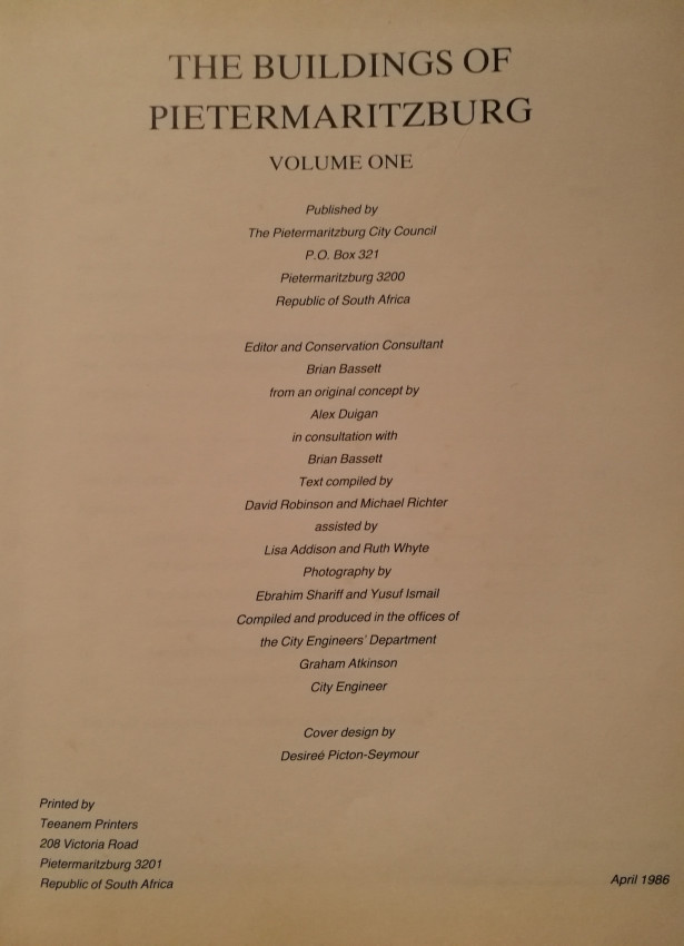 - Although this is was already a thick and heavy book, it was intended to be followed by a second volume to complete the cataloguing all the important buildings of Pietermaritzburg; no second volume, however, seems to have been published