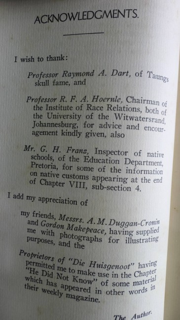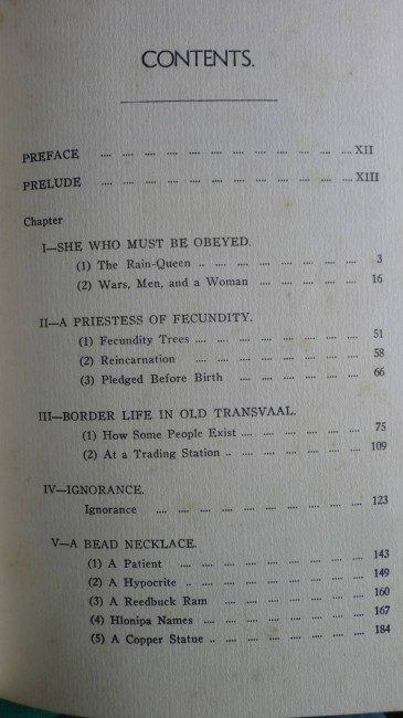 The book is a series of popular stories based on tribal legends, from the Northern Transvaal (including Vendaland and the Rain-Queen), Basutoland and elsewhere. The author acknowledges advice and encouragement from Professors Dart and Hoernle from the University of the Witwatersrand, and information on native customs from a senior member of the Education Department in Pretoria.