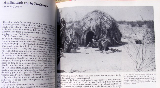 ‘The idea for this popular yet definitive book about the Bushmen was first conceived some seven years before its final publication. Twelve scientists and researchers from many parts of the world – from Canada to Botswana from Texas to Australia – each an expert in his field have contributed to this lavishly illustrated volume and the result is a readable work about a fascinating people. It is probably the most comprehensive book yet written about them. (from the dust-jacket).