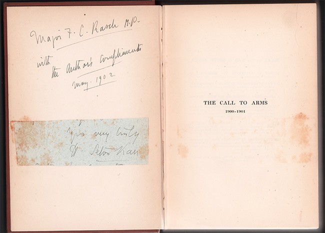 Presentation inscription on the front free end paper reads: ‘Major F. C. March M.P. with the author's compliments May 1902’.
