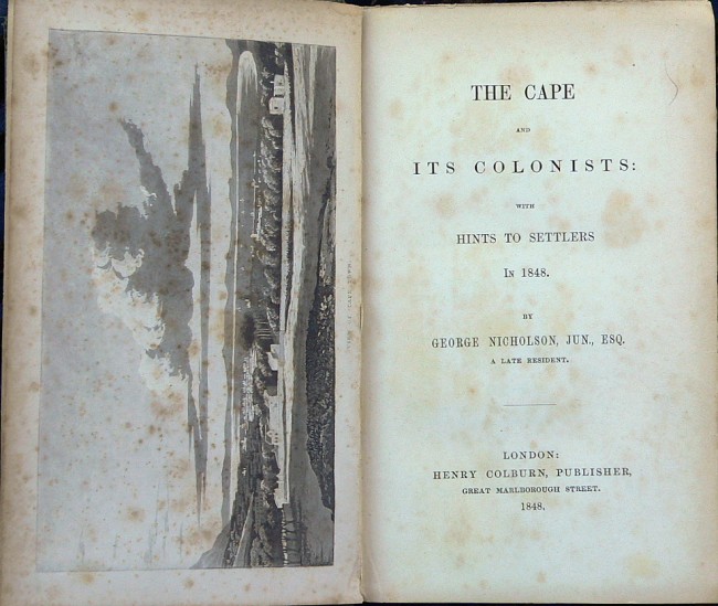 \"During his residence in Cape Town, and in the course of his journeys, the author saw a good deal of the Cape Colony.Nicholson deprecates the efforts of the Colonial missionaries. With regard to the Boers it is maintained that the \'hasty, fanatical, and oppressive manner in which the emancipation of the slaves was conducted in the Cape Colony\', had converted those previously loyal subjects to bitter enemies.\". (Mendelssohn) Mendelssohn III 543.