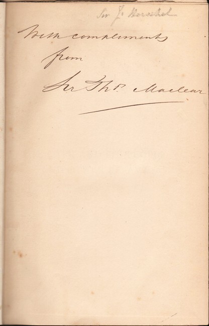 Presentation inscription on the second free endpaper, ‘With compliments from Sir Thos, Maclear’ and the pencil signature of Sir John Herschel at the top of the page. Stamp of the Herschel Library, Collingwood on the title page.