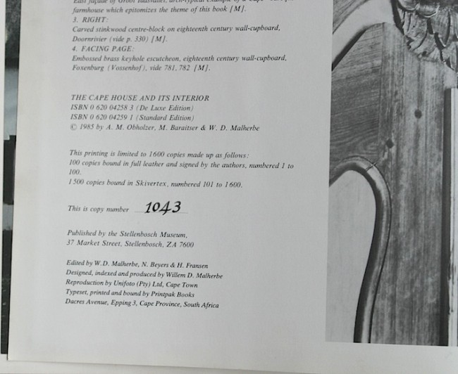 Hard Cover, gilt titles and illustrations on boards, Limited/numbered edition number 1043 of 1600 copies, 419pp profusely illustrated. A comprehensive survey of Cape architecture, looking at the early settlers to the Cape, furniture, as well as a detailed survey of woodwork and metalwork. Covers all regions of the Cape. Dust Jacket rubbed, worn at edges and tear on front repaired, internally fine. "The Architecture of the Early Cape of Good Hope is considered by many art-historians to be the major South African contribution to world culture... The Cape House and its Interior presents the first comprehensive survey of these important aspects of Africana".