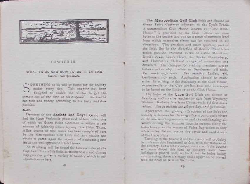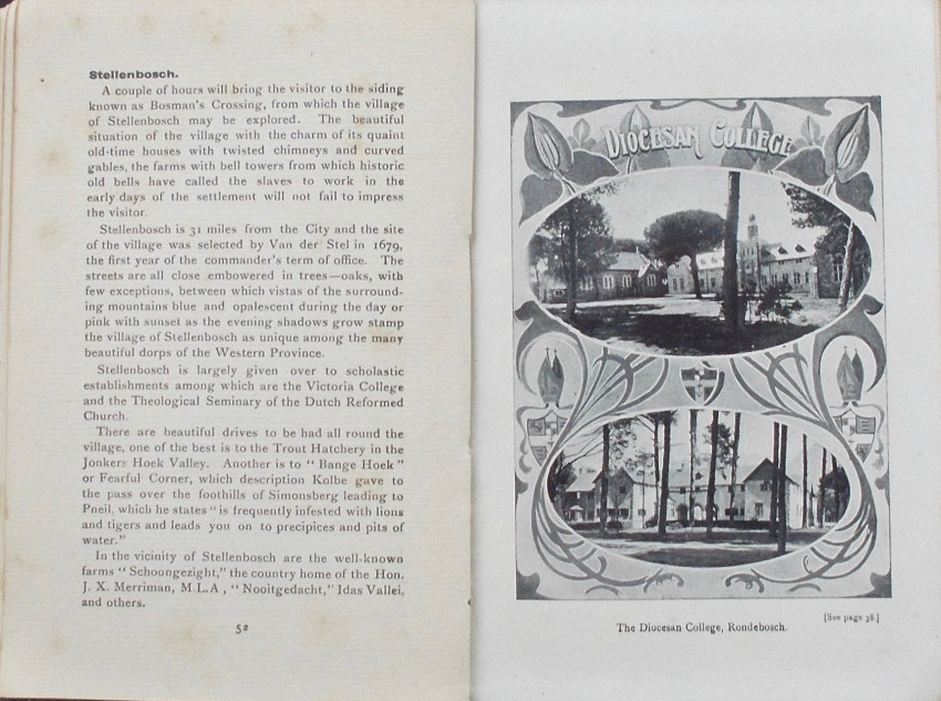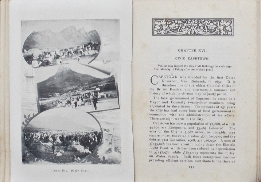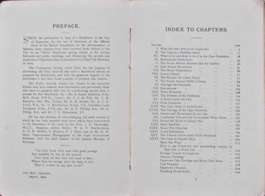 Contents include: The Cape as a Holiday Resort; What to Do and How to Do It in the Cape Peninsula; Educational Institutions; Gala Season Excursions; Groote Schuur; Through the Peninsula; Simonstown; Table Mountain; A Drive round the City; Civic Capetown; Constantia Vale and the Government Wine Farm; Short Rambles; Local Institutions; Short Sea Trips; How to see Capetown and Surrounding Country by Taxi Cab or Motor Car; Masonic Meetings Capetown Cab, Carriage and Motor Taxi Fares etc.