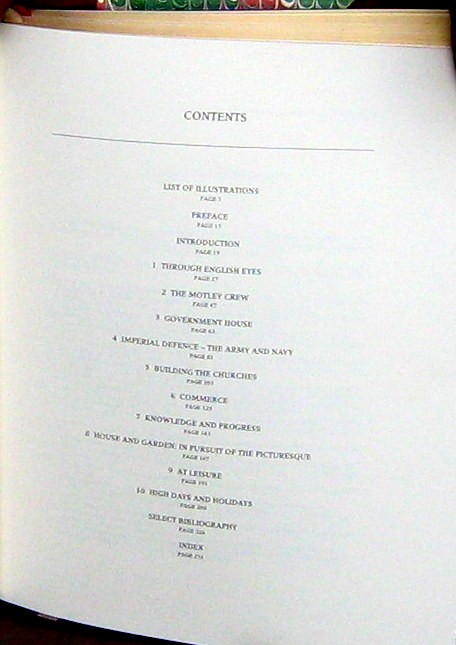 Number 10, Graham Viney & Phillida Brooke Simons, (editors), 1994, 236 pages. Through English Eyes, The Motley Crew, Government House, Imperial Defense, Building the Churches, Commerce, Knowledge and Progress, House and Garden: In pursuit of the Picturesque; At Leisure; High days and Holidays, Selected Bibliography.