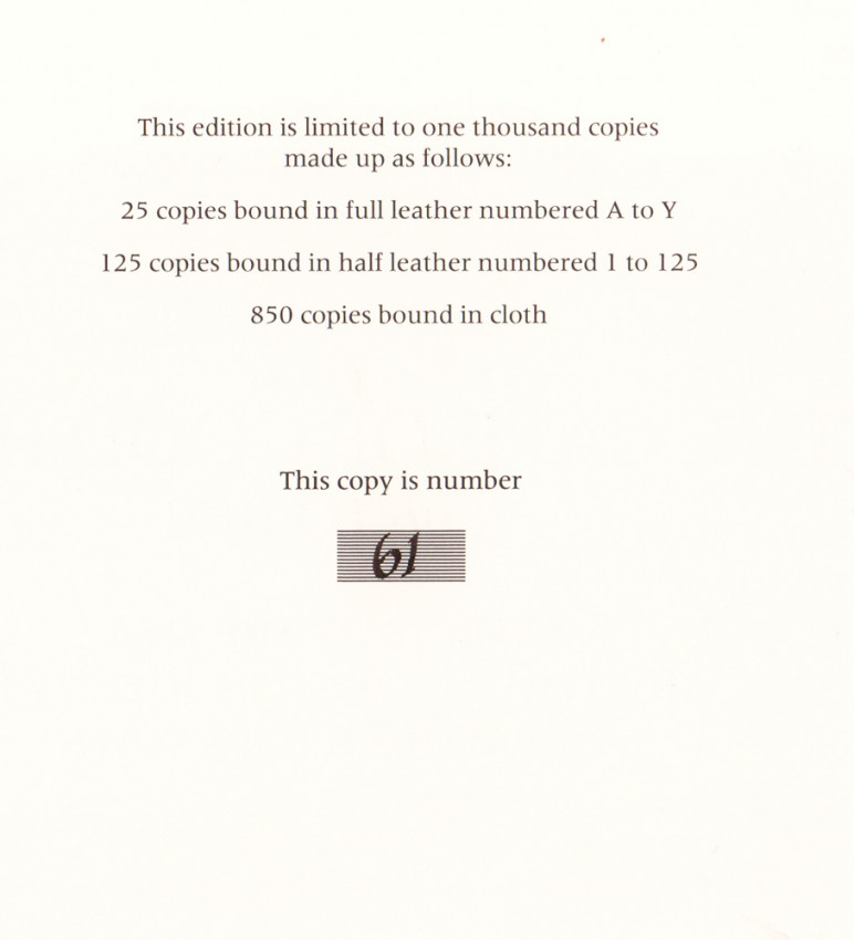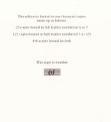 This edition is limited to one thousand copies. 125 copies bound in half leather numbered 1 to 125.