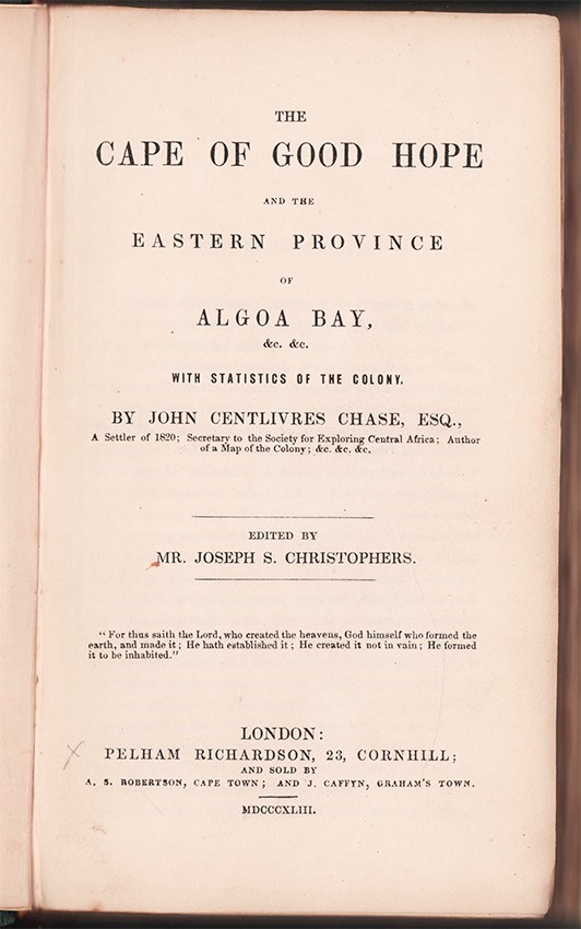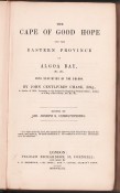 Mendelssohn (Sidney) South African Bibliography vol.1 page 324: An accurate account of the Cape at this period, containing, in particular, a large amount of information respecting the 1820 settlers, and the Eastern Province generally. In the Preface, the editor, Mr. Joseph S. Christophers, refers to an article written in the Quarterly Review for November 1819 (see Cape of Good Hope, ex. Quarterly Review, 1819), and while paying a tribute to the sagacity of the writer, " congratulates those who promoted the emigration," and the foresight of those who prophesied the success of the scheme. The volume is, divided into three Parts and an Index, and Part I. deals with the discovery and occupation of the colony, and gives a general description of the country, with more special reference to the Eastern Province, and including a " history of the origin and progress of the British settlements in 1820." Part II. gives details respecting the Government, law, religion, education, and schools of the Cape, together with some information with regard to its press and periodical literature, agriculture, trade and commerce, progress, &c. &c. Part III. gives particulars of the advantages offered by the country to emigrants, with hints to intending settlers. There is also a large amount of miscellaneous, but valuable information, in the Index.