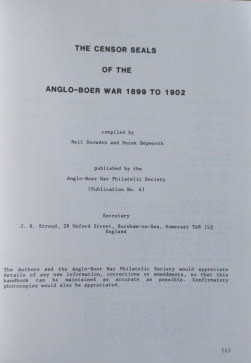 Introduction/ Censor Seals from the Boer side/ Censor Seals from the British side/Censorship by both sides/Contributors/Annexes. Wth photographic images and examples.