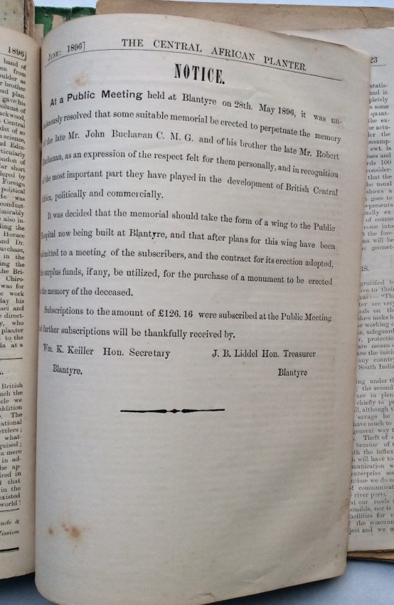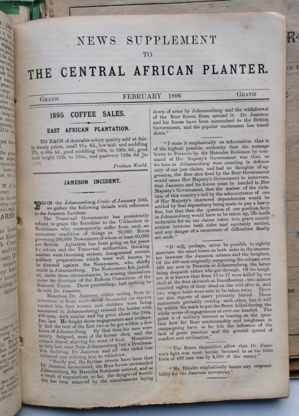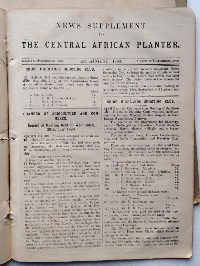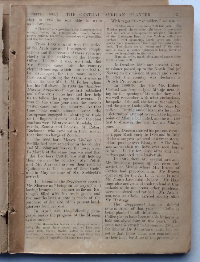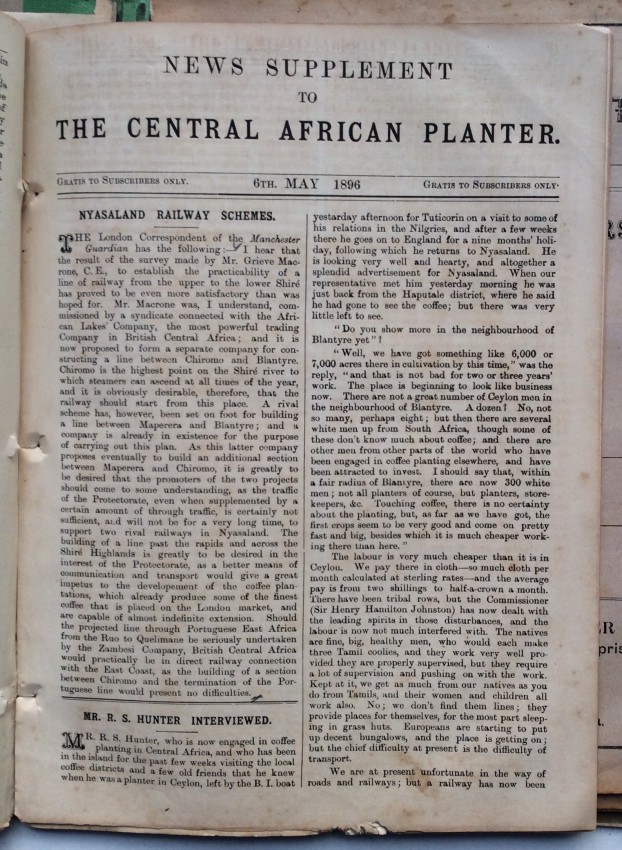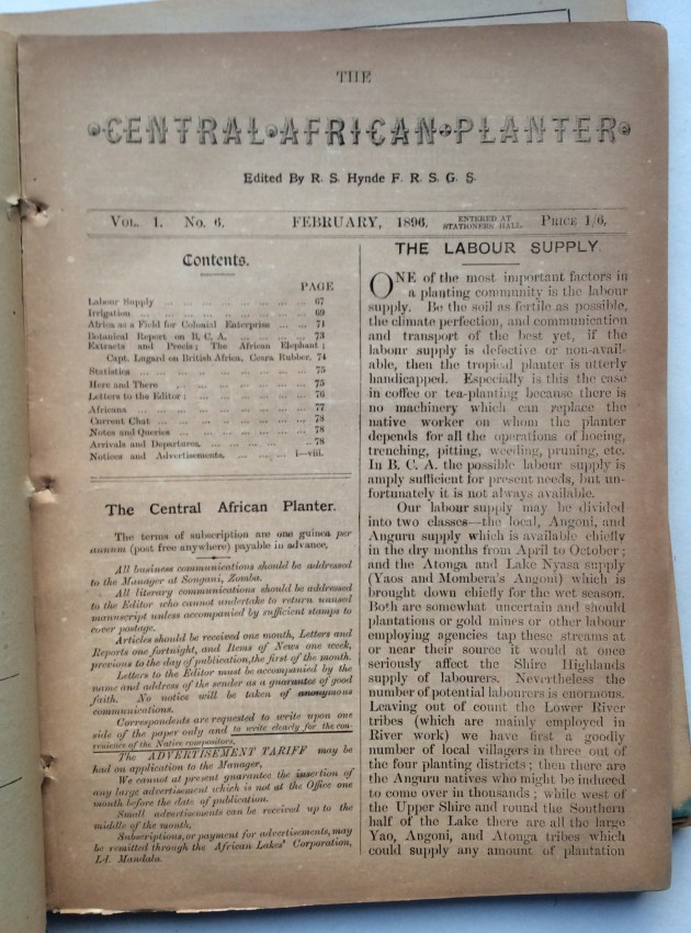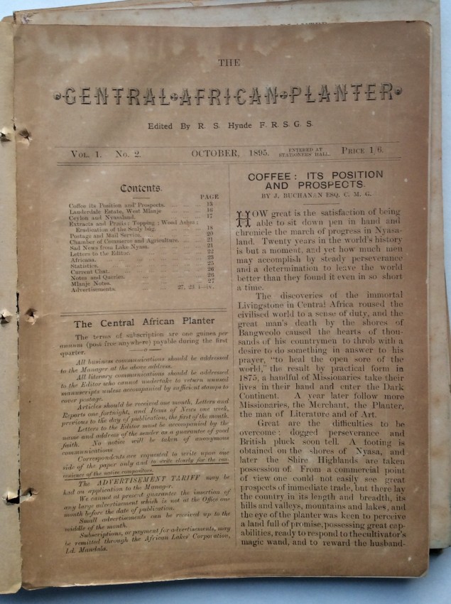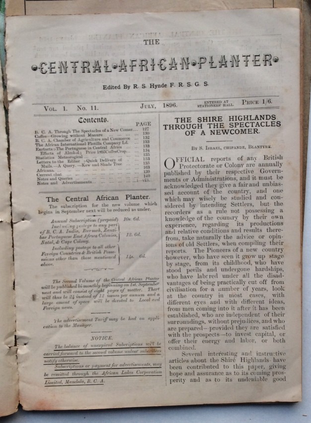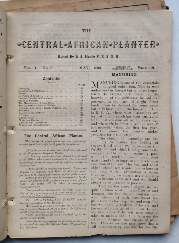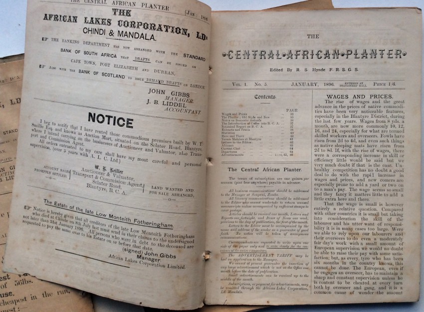 A. Schwarz, writing in the 'Society of Malawi Journal' (vol.36, number 2, 1983, pp.10-11), noted that the "contents of the paper cover a far wider variety of subjects than would appear from the title. There of course many articles on crops, at a time when there was much thought and experimentation, and no real idea of what was suitable and would emerge as a major source of revenue for the country. Coffee cultivation was thought to qualify for that, and there were number of articles on the crop .... But there is something for everybody ... such as articles or letters to the Editor on wages and labour problems, tax complaints, arguments about the Chamber of Commerce and Agriculture, notes on the climate and rainfall data, health and hospitals, transport problems, banking and the issue of notes, and so on. Then there are the advertisements, quite fascinating ones, for instance the sale of a grand piano, for £40 - at a time when it must have come up by headload from the Lower River. It is in fact a wonderful chronicle of its day."