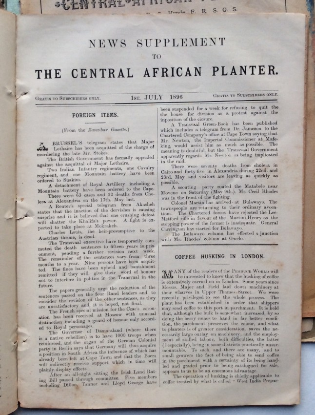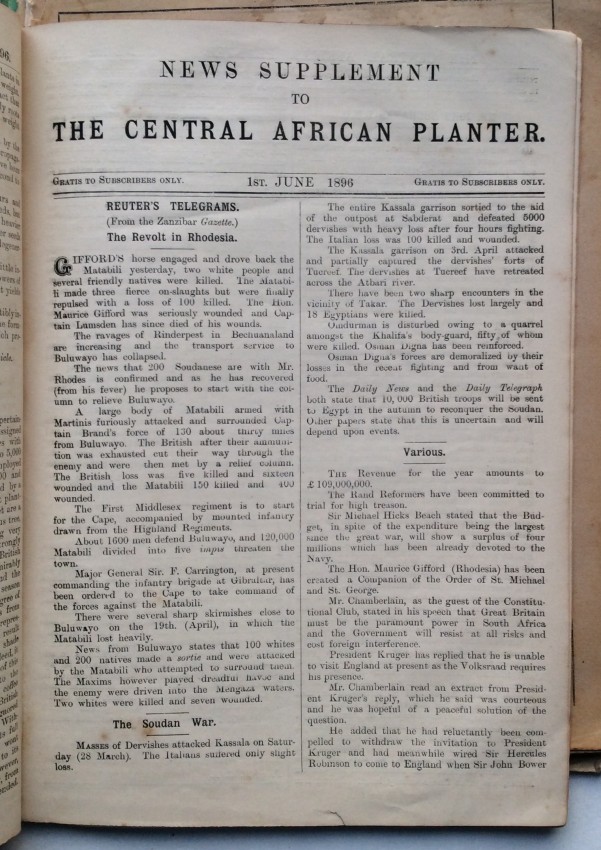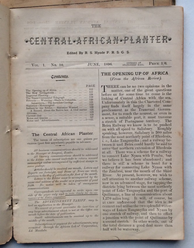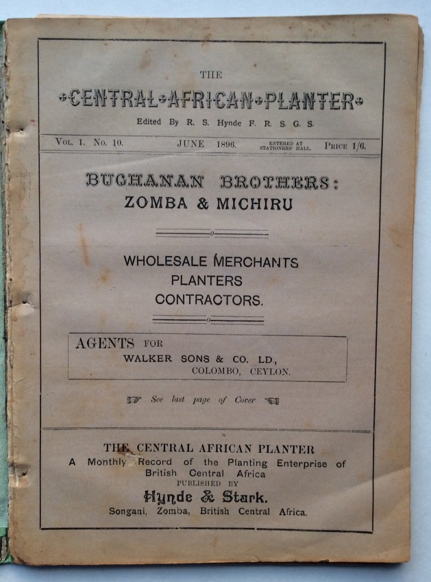 A "wonderful chronicle of its day" (Schwarz) - a substantial selection from the very rare and short-lived "The Central African Planter" - including material not present in the facsimile edition. A facsimile edition of numbers 1-12 of "The Central African Planter" was issued, in a limited edition, in 1984 (see https://catalog.hathitrust.org/Record/012508422) using the copies held by the Society of Malawi (and apparently lacking all text for number 5, and 10pp. from number 10, both of which is present in the selection offered here). "The Central African Planter" continued for another year, before closing but Hynde later founded "The Central African Times".