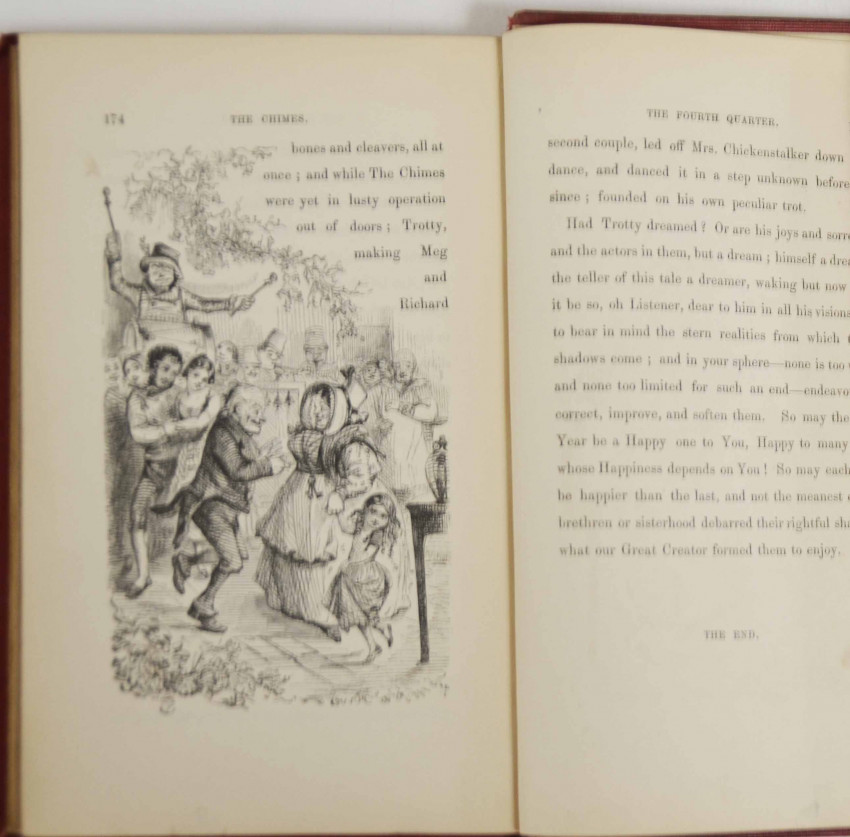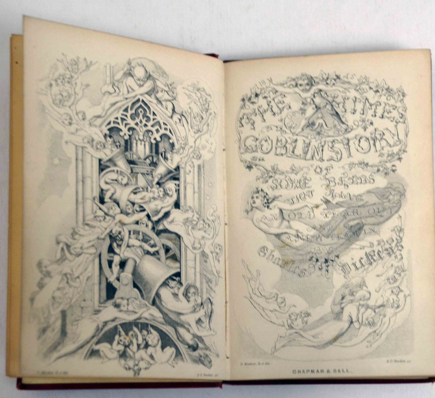 1. The Chimes. A Goblin Story.1845.Chapman & Hall. First Edition, with the second state engraved title page with the publisher's name below the vignette. 175 pages of text illustrated with a frontispiece, engraved title page and eleven engravings in the text by Maclise, Doyle, Stanfield and Leech. In the original gilt embossed cloth which has slight wear at the joints and extremes of the spine. Both inner hinges are starting but firm. An about very good copy.