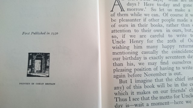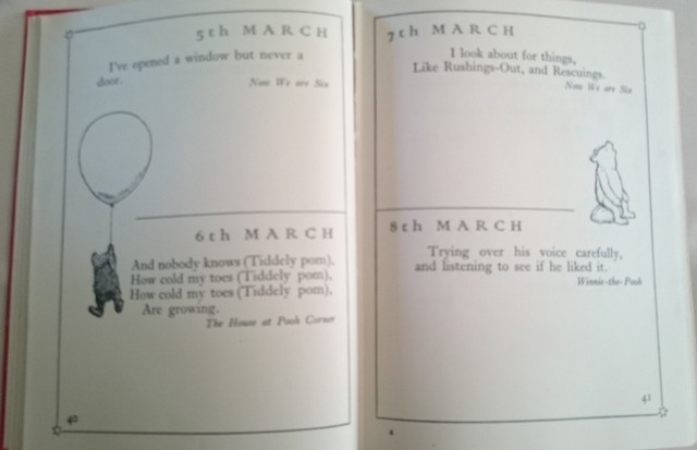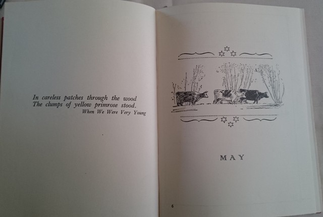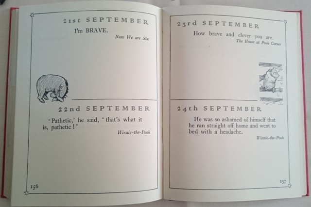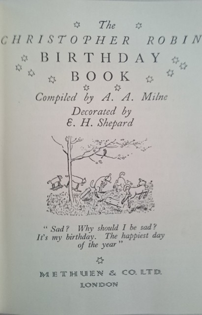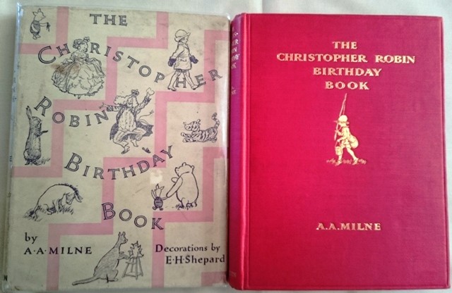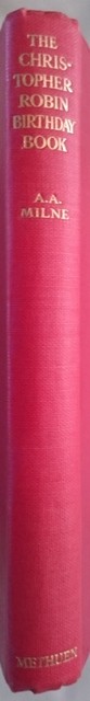 First Edition, 1930; Methuen & Co. Ltd., London. With dust jacket. Duodecimo, 13 x 16.5 cm., vii [1] 215 pp. Red cloth boards with gilt titles to front and spine. Gilt illustration of Christopher Robin carrying a fishing rod to front board. Illustrated title page with a small picture of lambs frolicking around a tree, with title ‘The Christopher Robin Birthday book compiled by AA Milne Decorated by E. H. Shepard’ and ‘Sad? Why should I be sad? It's my birthday. The happiest day of the year’. Illustrated dust jacket in pink and cream, with black titles to front and spine and publisher’s advertisement to rear.