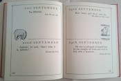 A wonderful date book for birthdays. Each page features a black and white illustration and two dates of the year, each with a character quote; along with blank space for the owner to enter birthdays. Completely unused and blank throughout.