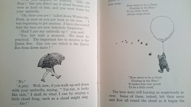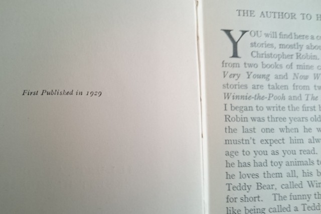 From the introduction: “ You will find here a collection of verses and stories, mostly about a little boy called Christopher Robin…I began to write the first book when Christopher Robin was three years old, and I finished writing the last one when he was just eight, so you mustn't expect him always to seem the same age as you read…The funny thing is that Pooh doesn’t like being called a Teddy Bear now, and if anybody says to Christopher Robin, ‘Is that your T___y B__r?’ Christopher Robin says very coldly, ‘No, it’s Pooh,’ and then Pooh and he go off whispering together.”